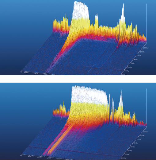 上面两幅图显示了一个汽车车身零件在冲压成过程的高频信号。上面第一副图像显示了一个完美的冲压过程,表示了零件与冲压工具的摩擦处于正常状态,而第二副图表示了该零件内部有缺陷产生了。因为这两幅图像的区别就是振幅在每个频率范围内上升的幅度不一样。高振幅的原因就是由于客户把冲压加工设备调整了参数而使零件内部产生了裂纹。这充分表明Optimizer4D的精准度和实时监测的能力。
